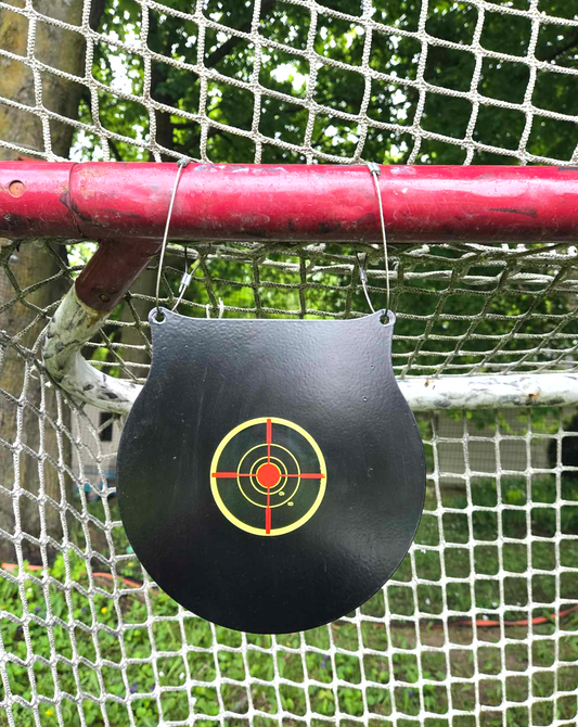 Our Steel targets are made right here in Ontario using Canadian steel. The cables are made from stainless steel. They are 8 inches and 1/8th of an inch thick. They are powder coated paint (highest grade possible)